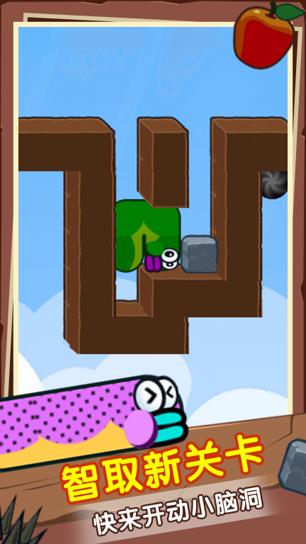 2、操控一条蛇穿越复杂地形,抵达远处的黑洞。吃掉一个苹果能让蛇的长度增加一个单位,要合理利用这一点。