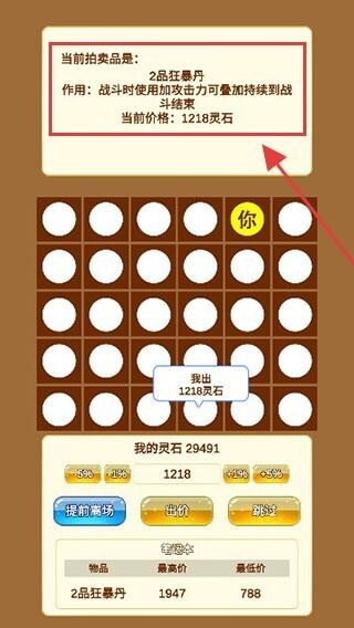 4、拍卖【2品狂暴丹】时留意当前【1218灵石】的价格,进行合理出价,借助物品提升战力以助力后续探索。