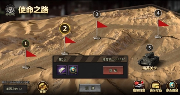 使命之路是一个连续闯关模式的玩法,玩家可以从第一关开始一直往后不停得打,关卡也会越来越难,直到打不过为止。每关都会和一波敌人进行一次战斗,每五关有一个精英关卡,是难度比较高的关卡,奖励也和其他关卡不同。