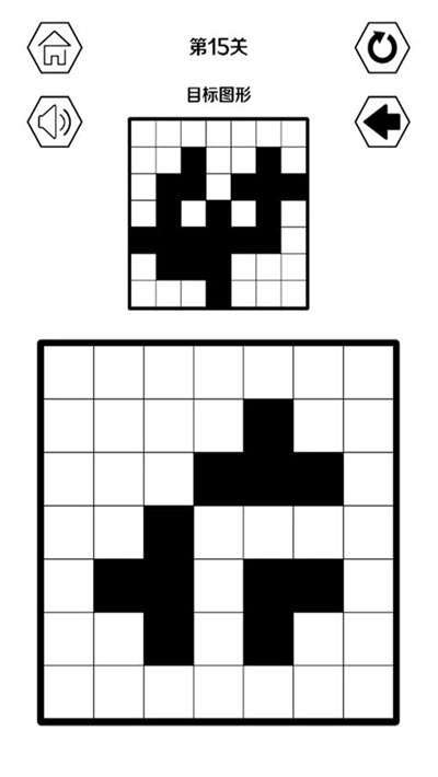 点击操作盘上的任意一格,这一格子以及它上下左右四个相邻的格子都会发生反色变化(即白色变为黑色,黑色变为白色),我们需要依据这一基本规则来拼凑出目标图形。