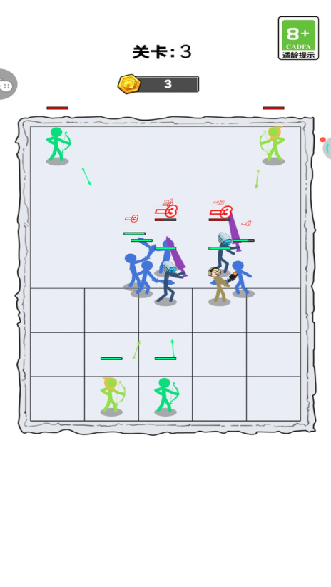 1、游戏里有多种火柴人角色可供挑选,像前排的蓝剑士和后排的绿弓手,每个角色都有着独特的定位与技能。