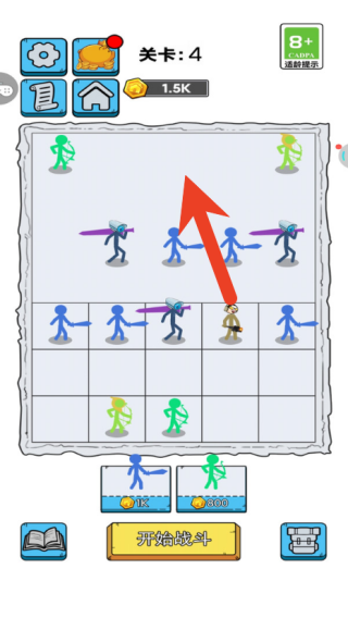 2、点击召唤各类火柴人战士后,可拖动调整他们的位置,搭建出剑士在前、弓手在后这类攻防兼备的阵容。