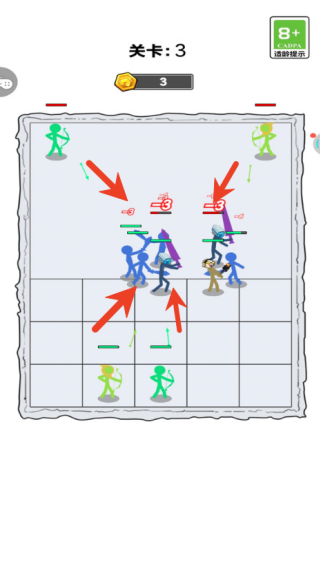 进入游戏后,先挑选关卡并明确目标,然后就可以召唤你的火柴人小队,开始排兵布阵迎接挑战了。
