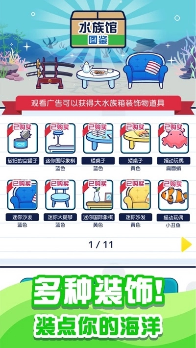 2、轻松的游戏体验也能带来无穷的游玩乐趣,无需花费大量时间,你就能打造属于自己的水族馆。
