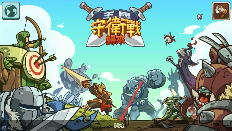 1、先安装《王国守卫战:归来》这款游戏,之后点击游戏启动界面的“开始”按钮,进入具体关卡,正式开启防御战斗环节。