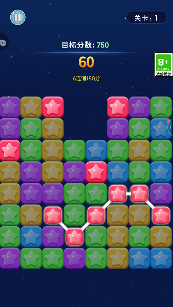 3、根据规则,用手指点击或滑动连接两颗及以上相同颜色的星星,即可触发消除效果并积累得分。