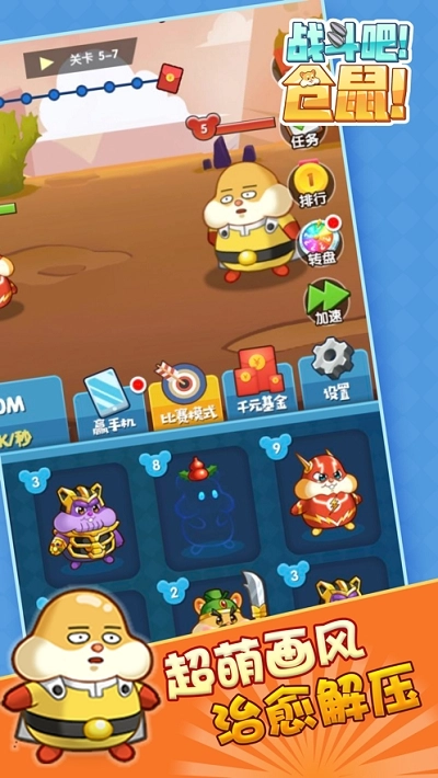 《战斗吧仓鼠红包版》是一款画风Q萌可爱、还能赚钱的休闲益智游戏。在游戏里,玩家可以收集各种各样的可爱小仓鼠,只要用心培养它们到一定阶段,就能获得红包奖励。当然,培养过程并不枯燥,还有坏蛋BOSS等你来挑战——把养得白白胖胖的小仓鼠派去打BOSS,想想就很有趣!感兴趣的玩家,快来试试《战斗吧仓鼠红包版》吧!