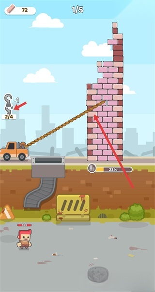 2.左侧的钩子是关键道具,朝着砖墙释放可借助拉力破坏建筑,要留意钩子的数量,合理规划使用以高效清除障碍,为应对僵尸创造有利环境,助力推进关卡。