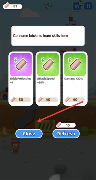 4.积攒砖块后打开技能界面,优先选择与自身风格相契合的技能,比如增加伤害或提升攻击速度的类型;消耗砖块学习这些技能可以增强战斗力。如果暂时没有合适的选择,点击Close按钮退出界面,保留现有资源以便后续进行配置。