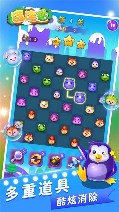 全民连连看领红包这款游戏整体采用了Q萌的卡通风格设计,内含海量丰富多样的关卡以及各种有趣实用的道具。
