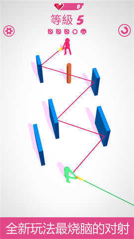 《勇敢的子弹》是一款超有趣的休闲射击小游戏!它的画面简洁清晰,玩法也十分新颖——借助物理反射原理,游戏里的子弹能实现弹射效果。玩家需要巧妙计算反射路径,精准命中那些绿色橡胶人靶子。感兴趣的小伙伴们,快来挑战试试吧!