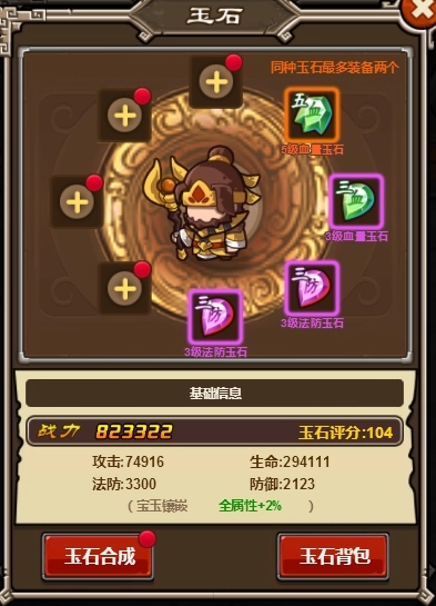 每个武将能穿戴6种固定类型的装备(具体类型一看便知),装备的培养方式和武将培养的思路大致相同。不过有一点区别:强化大师和精炼大师的效果是根据全身装备的最低等级来判定的,这么设置就是为了引导大家不要把资源都集中投入到某一件装备上。