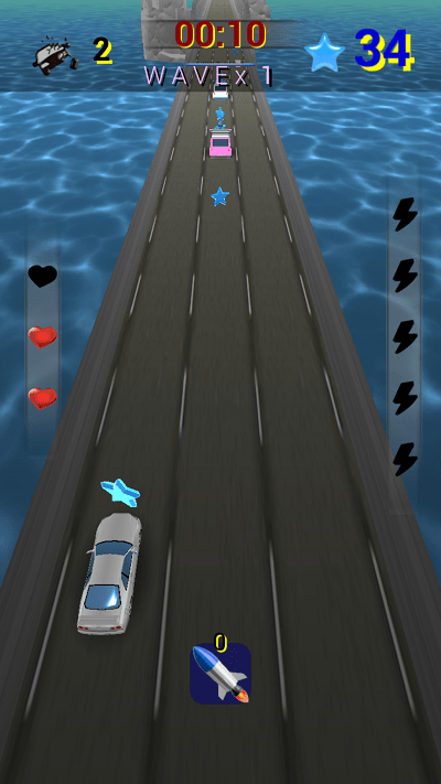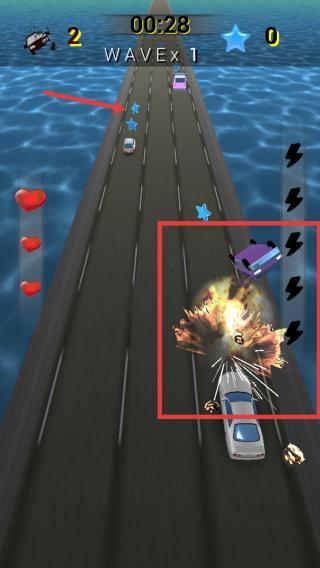 3、玩家操控的车辆在道路上行驶时,能够碰撞前方车辆以避免其挡路,与此同时还可以收集星星之类的道具来增加分数。