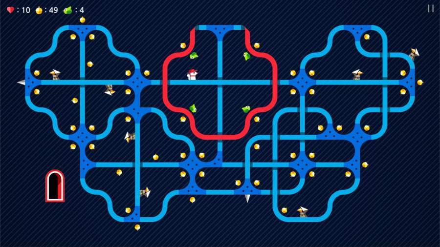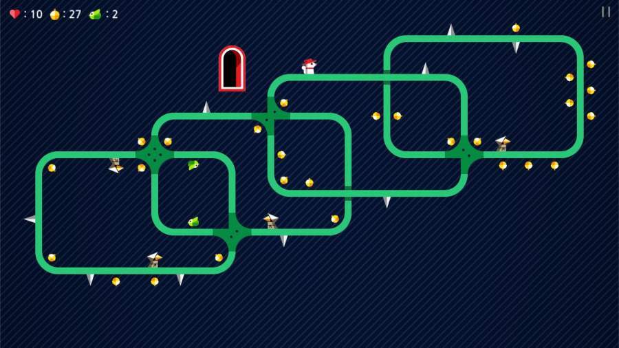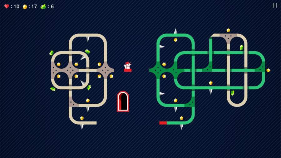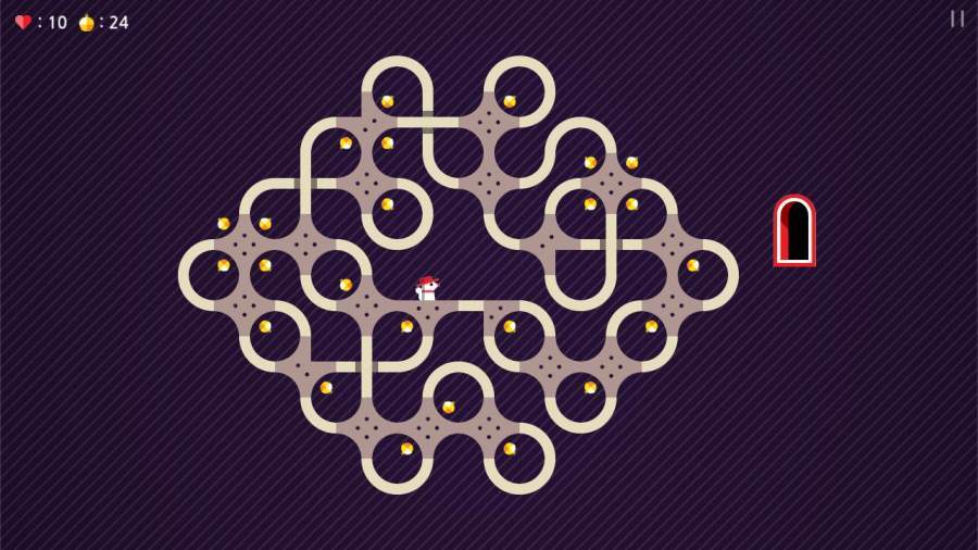 这是一款画面风格比较简约,但玩法十分考验思维能力的休闲益智类游戏。在游戏里,玩家会化身为戴着红帽子的松鼠多特里奥,因为它不小心闯入了布满机关的迷宫,所以玩家得把它引导到出口。沿途能遇到不少尖刺和僧侣,玩家只能在松鼠行进到拐角的时刻通过滑动来改变它的前进方向,借此让它走上正确的路径。