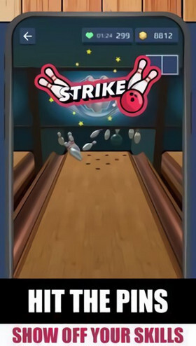 有一款保龄球题材的手机游戏,它逼真地模拟了这项运动的击球方式,玩家需要通过操作保龄球的投掷动作来完成击打;只有击倒更多球瓶、获得更高分数,才能顺利进入下一个关卡。