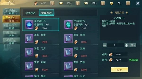玩法:玩家消耗荣誉兑换道具,兑换后有机会获得至宝进阶石、神弓进阶石,或是至宝技能书与神弓技能书。