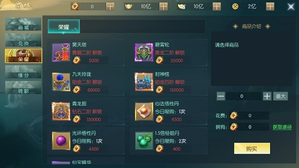 玩法:消耗荣耀值兑换道具,道具包括:至宝幻化、心法悟性丹、光环悟性丹等。