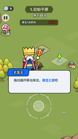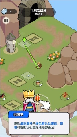 2、拖动虚拟摇杆确定建筑的摆放位置,选择在绿色箭头指示的地方建造箭塔,这样能增强防御能力。