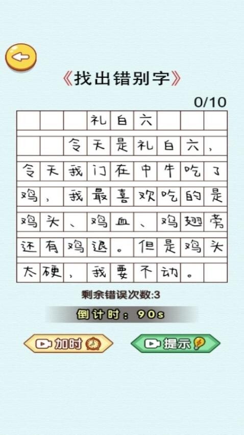 文字解压全辑是一款很特别的休闲游戏,包含多种文字类玩法。既能找错别字,也能体验当老师批改试卷的乐趣,每种玩法都有独特规则。游戏关卡设计得比较简单,只需按照题目要求找出答案即可,通关后还能解锁新内容。玩的过程中会摸索出一些小技巧,越往后的关卡也会越有趣味性。画面风格清爽简约,没有多余的花哨元素,很适合想动动脑筋又不想太费神的时候玩。闲暇时玩上两关,既能打发时间,还能锻炼眼力。