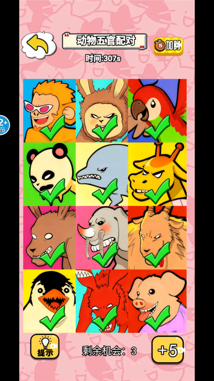 2、在应对多种动物混合排列的关卡时,可以按照动物的类别进行分组,先把同一种动物的五官归到同一类里,然后再逐个精准地摆放,这样能降低操作的失误率。