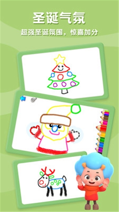 充满温馨的圣诞氛围,跟随轮廓来体验绘画六种可爱角色,还有十多种趣味动画与声音,在趣味画图里培养色彩感知能力,开发艺术潜能,提升想象力和创造力。
