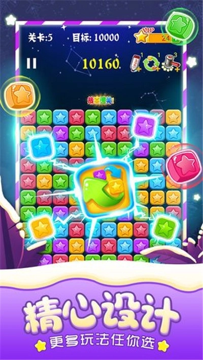 1、这里有上千个关卡等待解锁,消除相同颜色的星星,体验畅快乐趣的玩法升级;