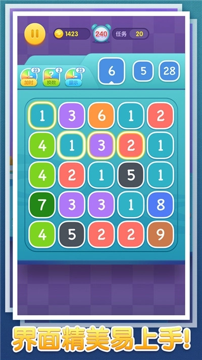 这款游戏简单到人人都能上手——把数字连成线就能得到目标数字。别看规则相当简单,可要是想拿高分,那难度能让人抓狂。在色彩缤纷的方块里,把数字连起来让它们合并变大,最终凑出目标数字。游戏界面简洁清爽,操作也很容易,还有丰富的关卡等着挑战你的智慧和脑力。