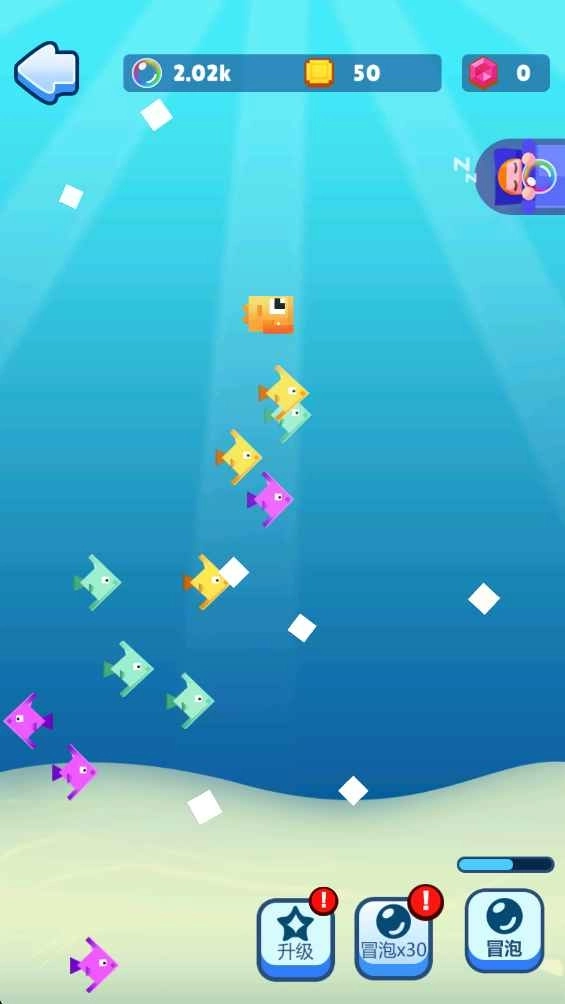 1、进入游戏,在海底收集气泡来解锁装饰,打造属于你的小鱼之家,点击吃掉其他的小鱼。