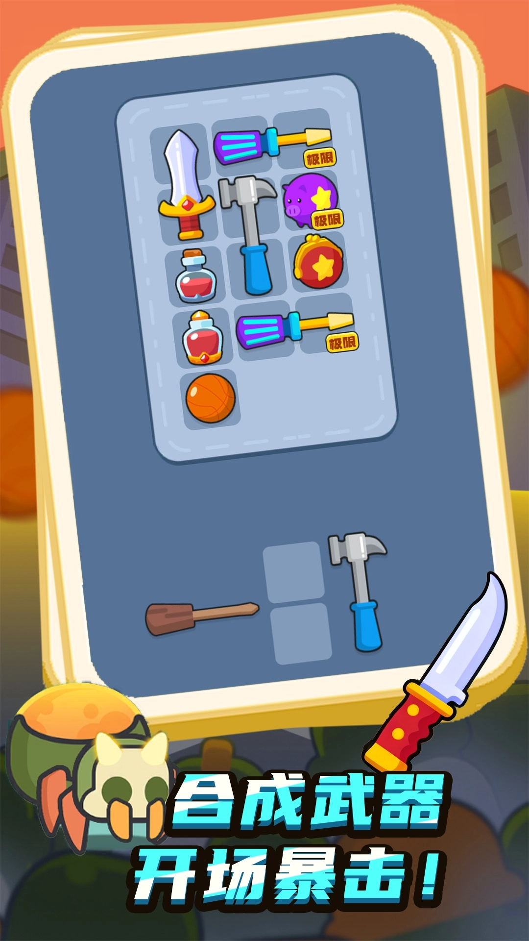 在合成勇士大冒险游戏里面,武器之间可以进行融合,例如锤子和木棒进行合成,可以得到攻击力更强的砍刀。将生命药剂和魔法药剂进行合成,能够得到召唤闪电的魔法药剂,对付大批量敌人的时候,就可以使用它啦!点开装备界面,玩家可以给角色搭配不同的武器和护甲哦!