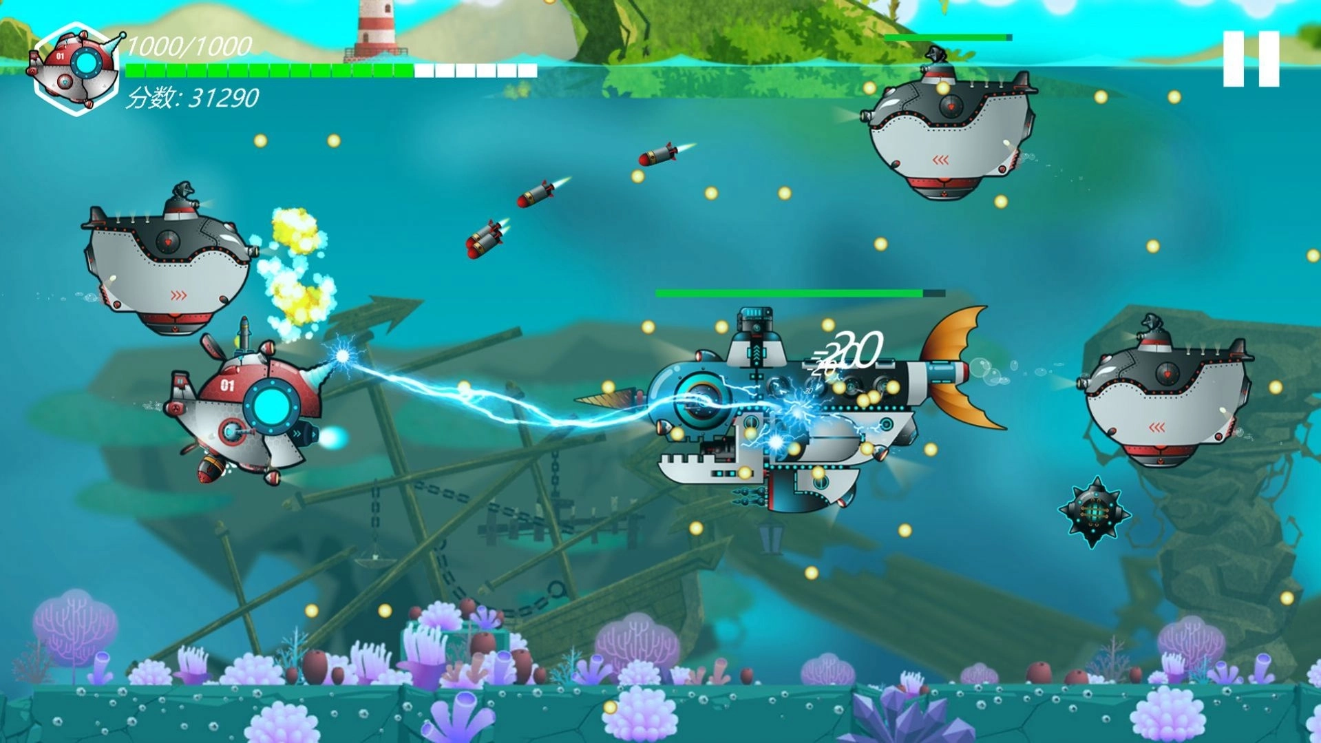 1、通过操作潜艇来消灭水中的各种动物,使潜艇获得多种技能。