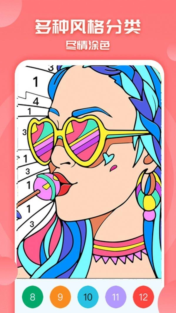 填色天小画家游戏是一款涂色类的休闲益智。游戏中拥有大量的素材插画,各种不同的风格应有尽有有人物,动物,花草树木,古风,动漫等等。玩家可以先找到自己喜欢的图片,再按照图片上的序号来找到相对应的颜色进行填色,直到所有的颜色都涂完,就可以完成一个作品了。