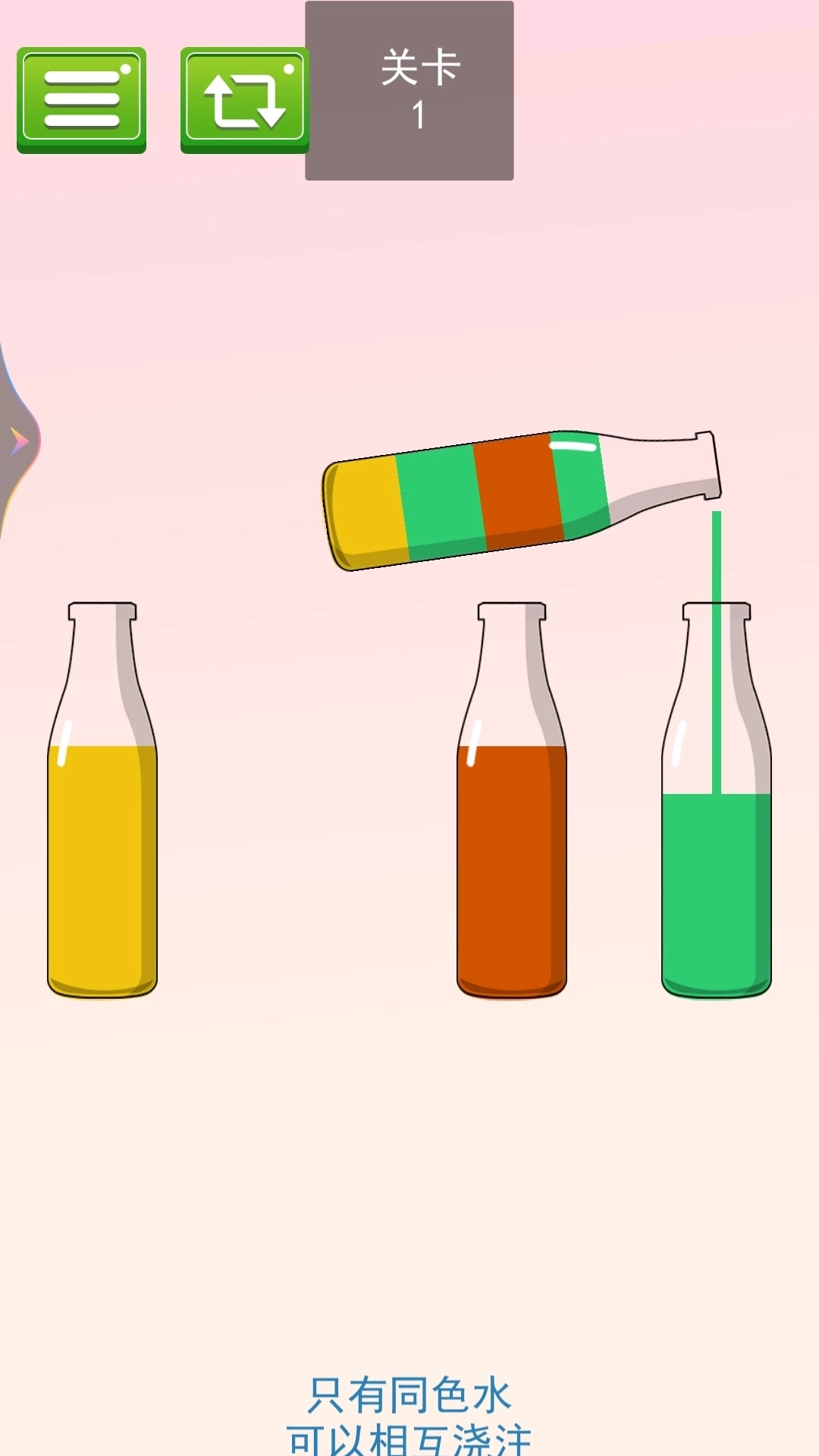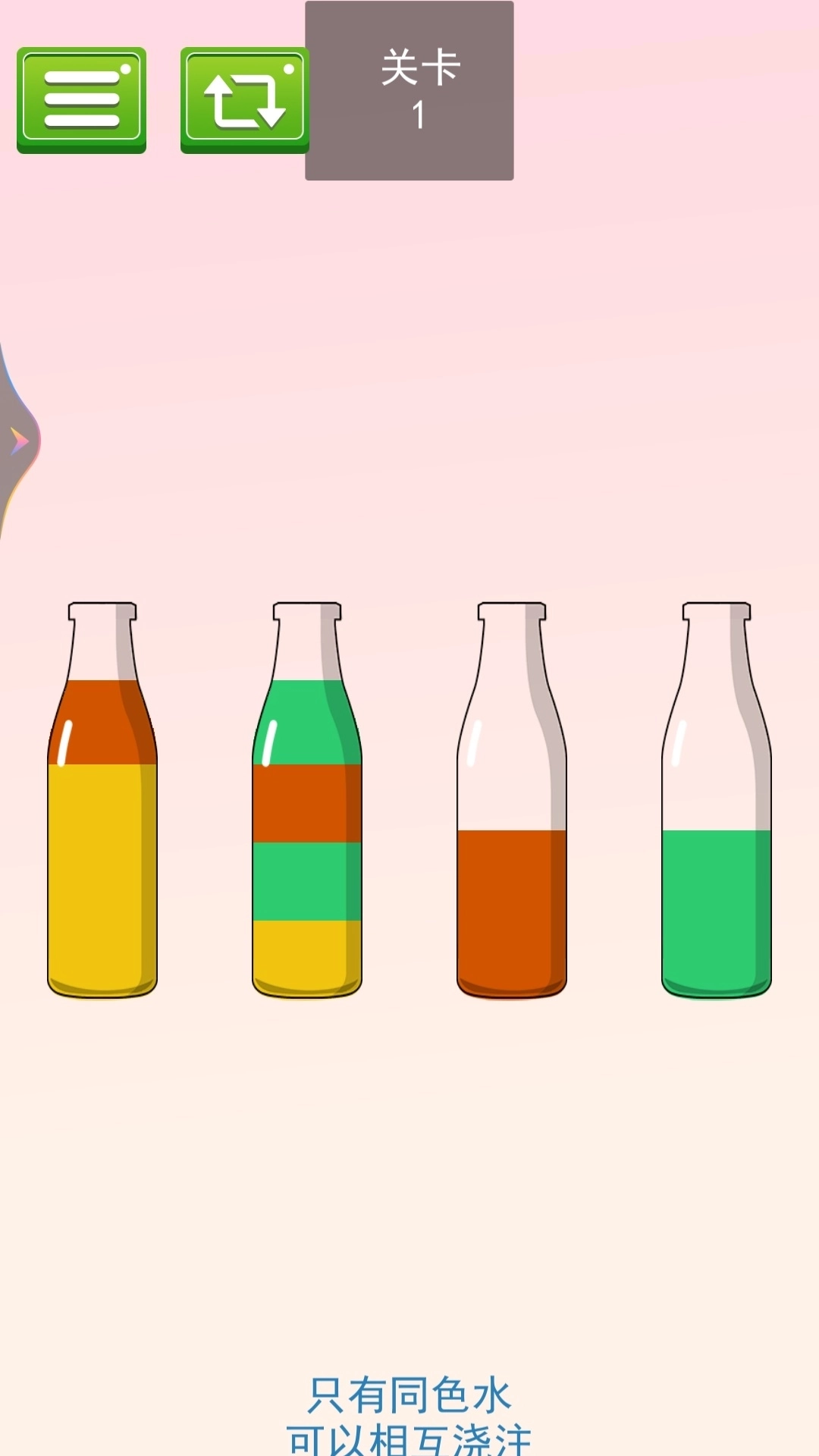 可乐瓶里面装着各种不同颜色的液体,它们之间有非常明确的分界线,只有相同颜色的水才可以融合在一起,玩家要把这些混在一起的液体倒出来,让每个瓶子里面都只有一种颜色。一起来排序游戏里面的瓶子个数是有限制的,所以玩家的倒水顺序非常重要,需要玩家提前规划好!