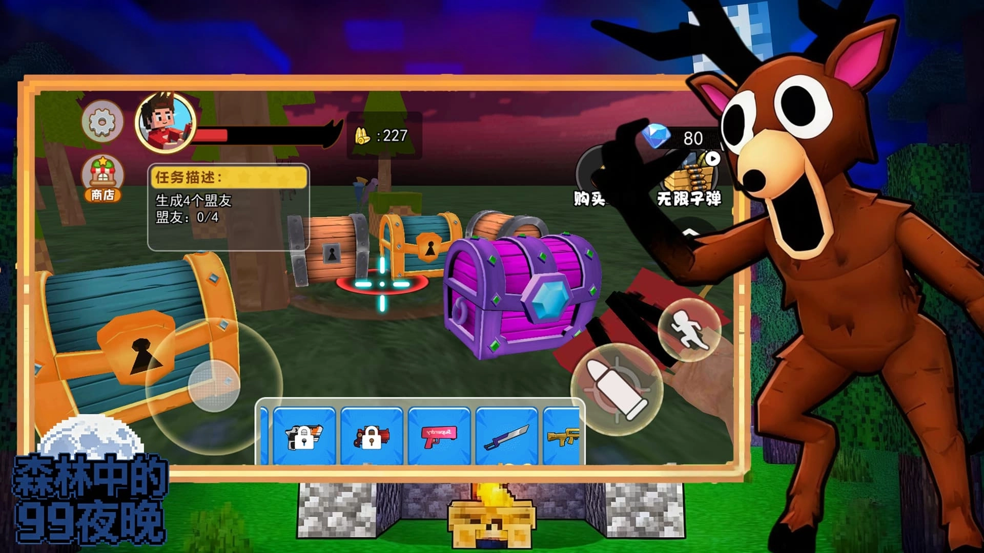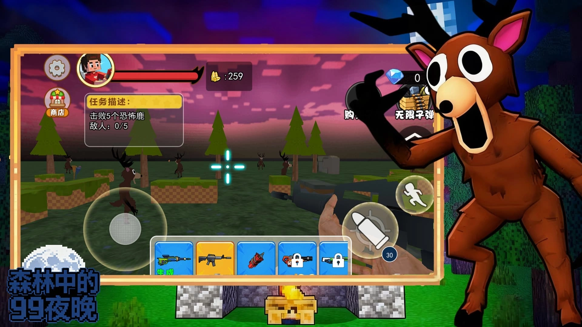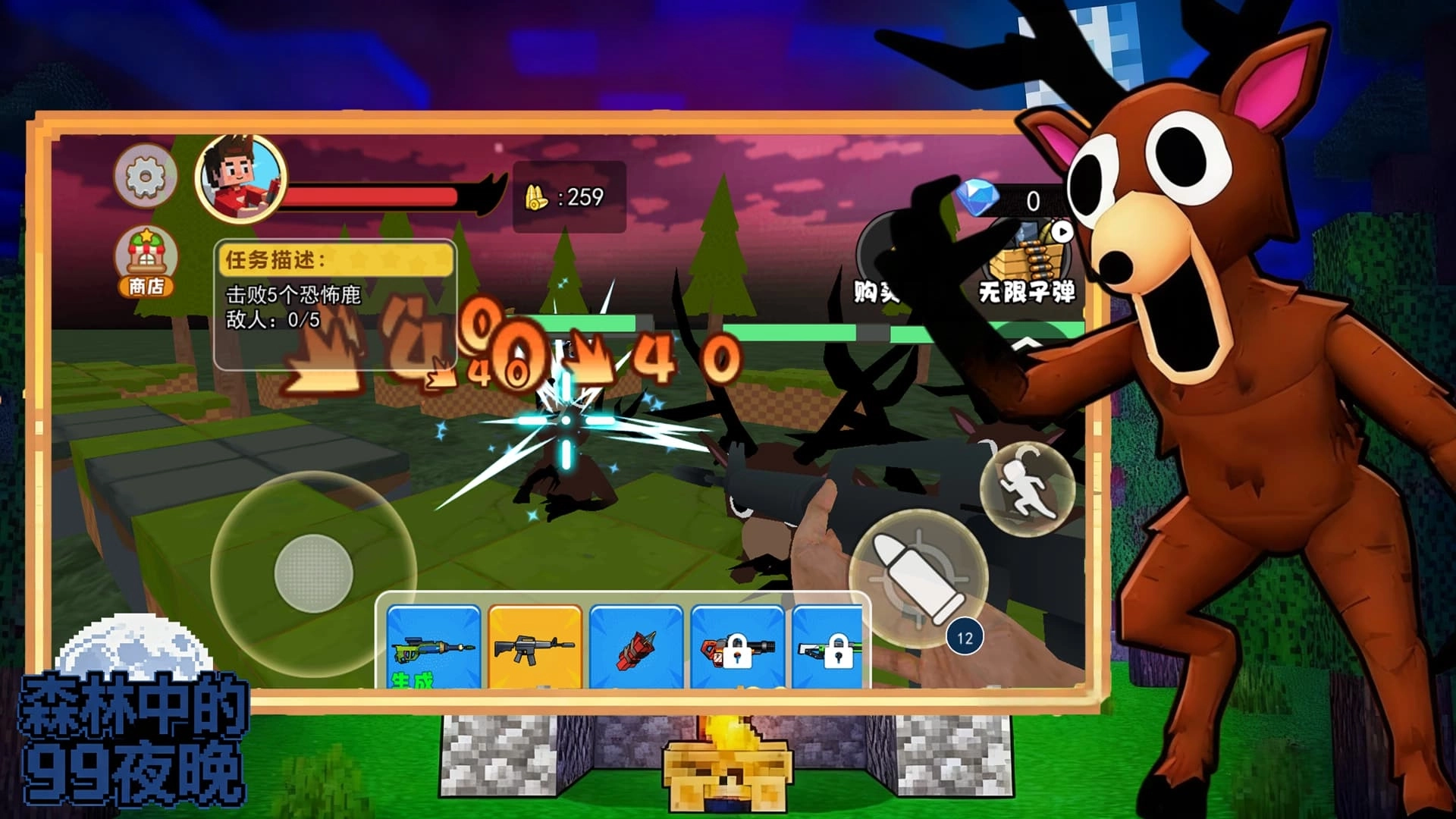 1、在无限的像素世界,你需要收集各种各样的物资和装备,才能应对恐怖鹿的袭击;