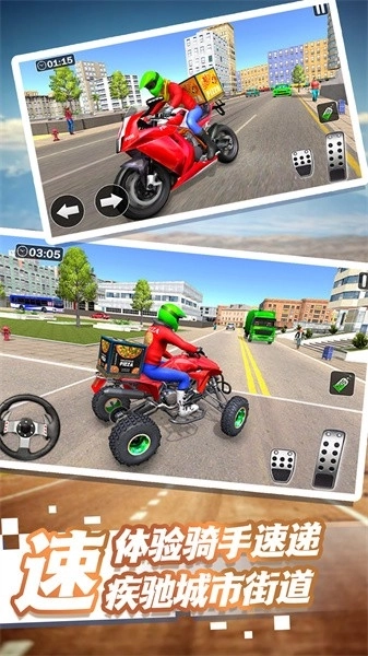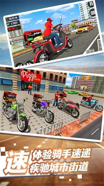 这是款超级好玩的模拟经营,玩家在这里扮演的是一个外卖小哥,每天都需要完成更多的配送任务,在配送的时候总是会遇到各种各样的路障和危险,玩家也需要小心的骑着自己的小摩托车进行送外卖,如果超时的话也会容易收到差评。一款非常精彩有趣的模拟送外卖的游戏,扮演外卖小哥,去自由挑战各种不同的外卖任务,在整个游戏过程中,也会遇到各种各样的路障和危险等,小心谨慎驾驶,注意遵守交通规则。