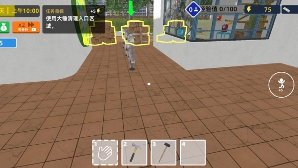 3、走到水上乐园门口,点击锤子将门口的物品全部清理掉,让乐园恢复整齐,就可以完成第一项任务。