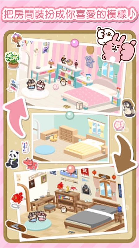2.人气原作角色与可爱的画风,P助、粉红兔兔、那那喵咪等角色带来的熟悉感与治愈感,会让人忍不住想一直玩下去。