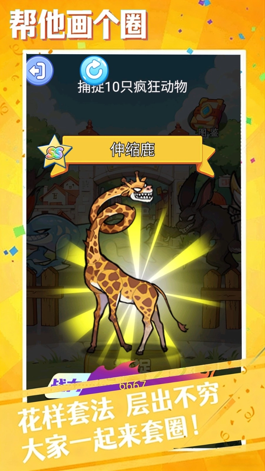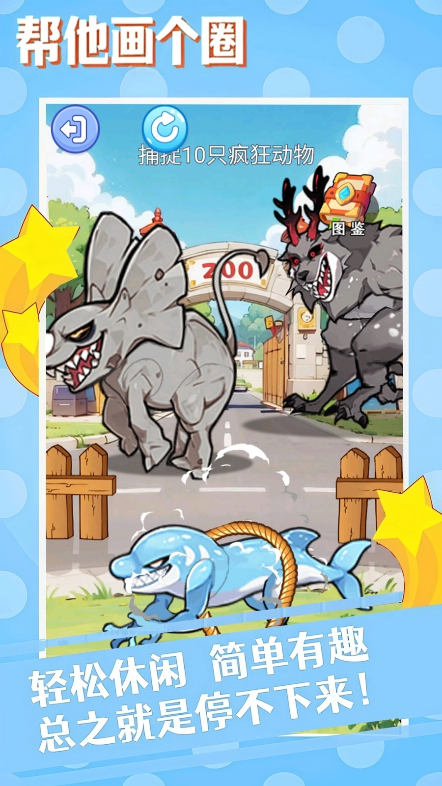 帮他画个圈游戏是一款可以让所有玩家在休闲时光获得超多欢乐的游戏。融入了超搞笑的卡通画风元素,在游戏闯关过程中,你会化身一个套圈王者,在你的面前会经过各种搞怪动物,你要先把绳子套成一个圈,然后精准的点击捕捉,就可以套到动物,将它们牢牢抓住。