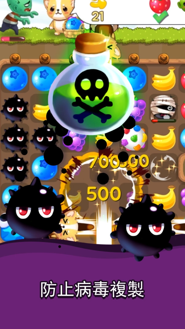 你得在它们快要变成僵尸的时候把它们消除掉,这样才能拯救你的小镇。经典的三消玩法让你轻松上手,还有各种各样有趣的道具。