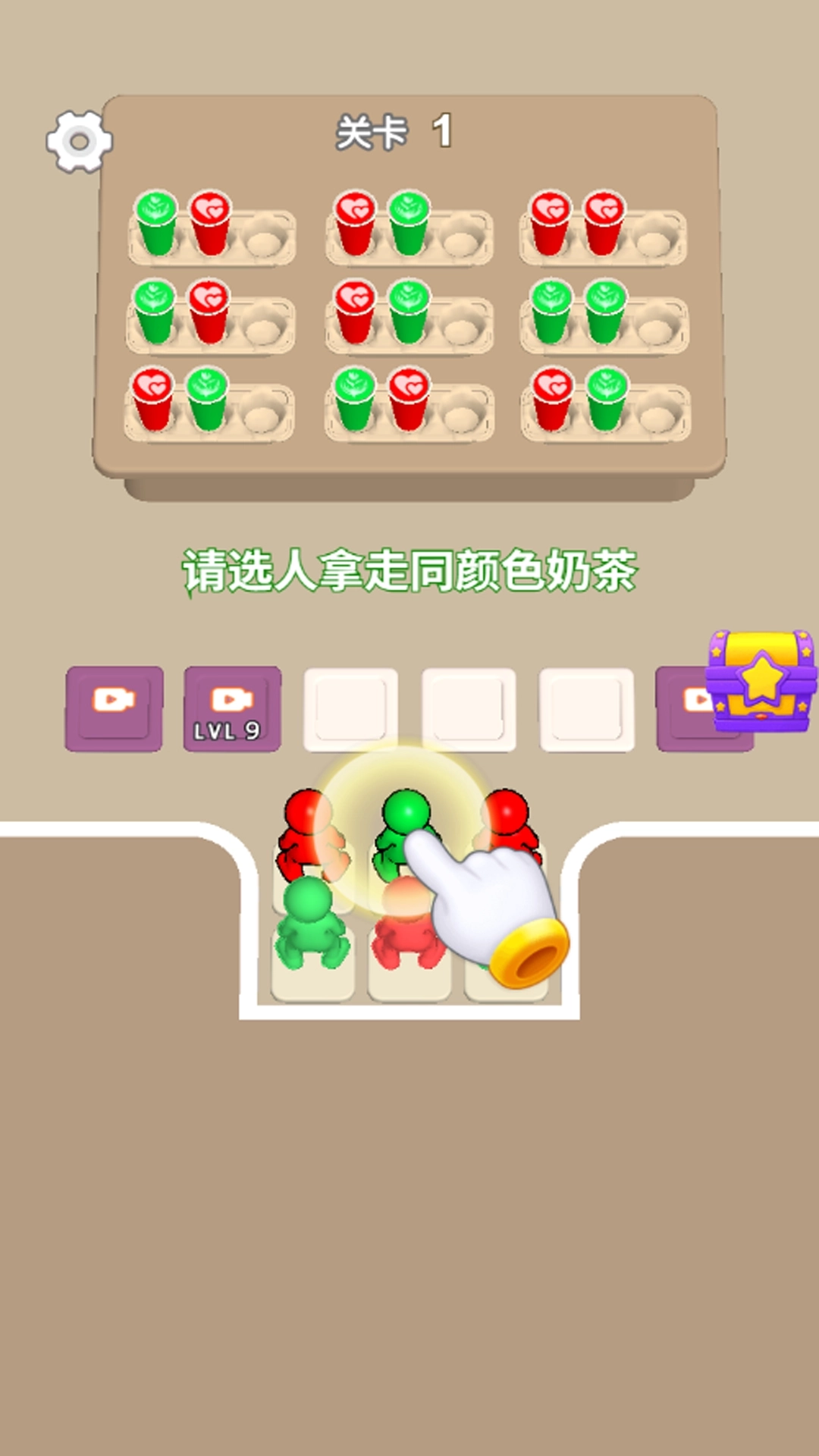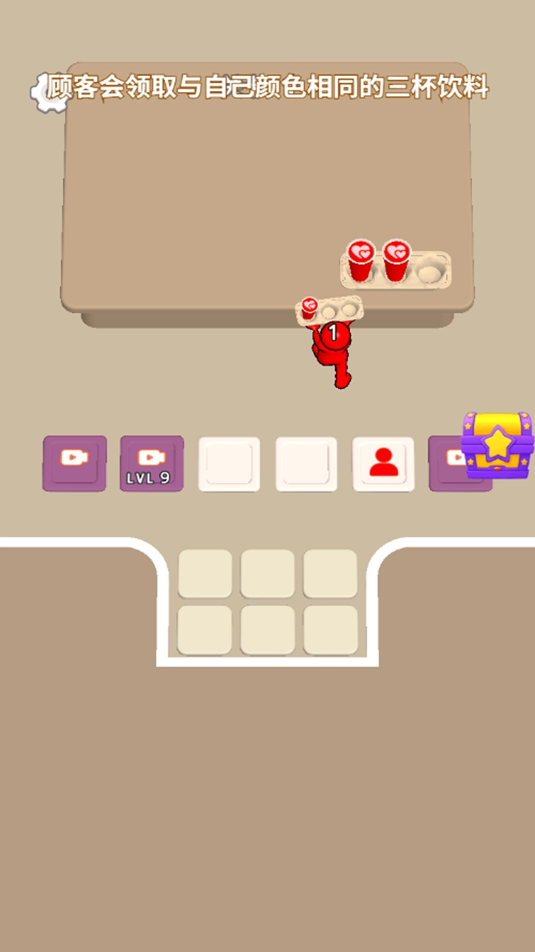 1、点击顾客,顾客会领取与自己颜色相同的三杯饮料,成功的领取三杯即可完成任务。