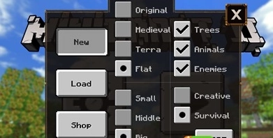 2、玩家可自由选择,另外勾选处提供三个选项,可分别选择是否生成树木、动物与敌人,同时还能设定地图大小及游戏模式,包括创意模式和生存模式。