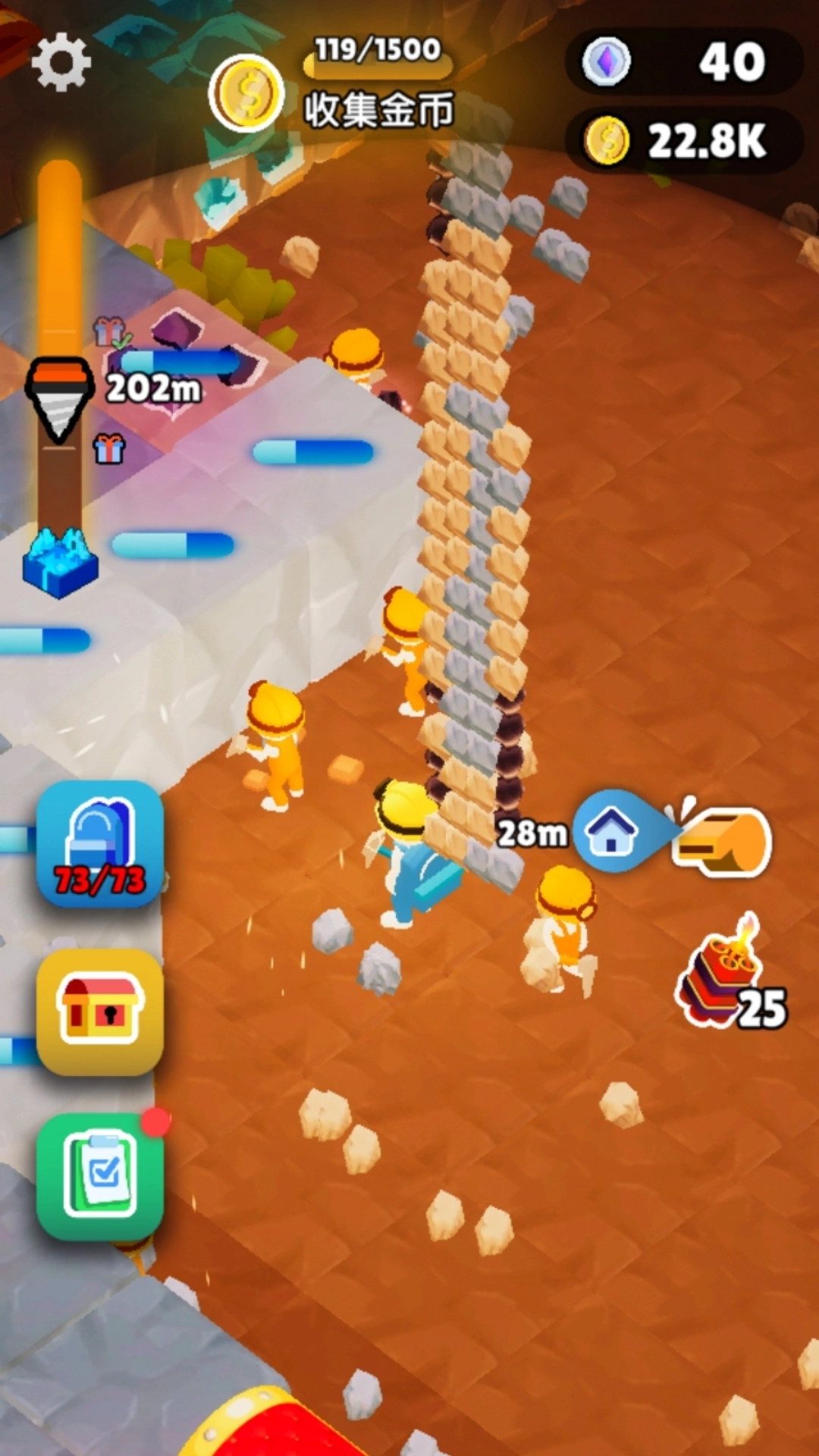 2、你需要合理编队,派遣他们前往不同深度和类型的矿层进行作业,并通过培训提升他们的技能;