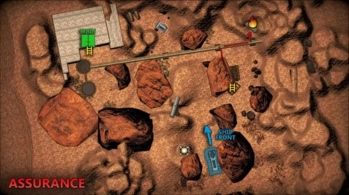 Assurance保证:进入设施的最佳方式是爬上着陆场附近的缓坡,然后直行至入口。离开时需绕过山丘,因为另一侧过于陡峭。可通过爬高梯子跳到管道上找到消防出口。