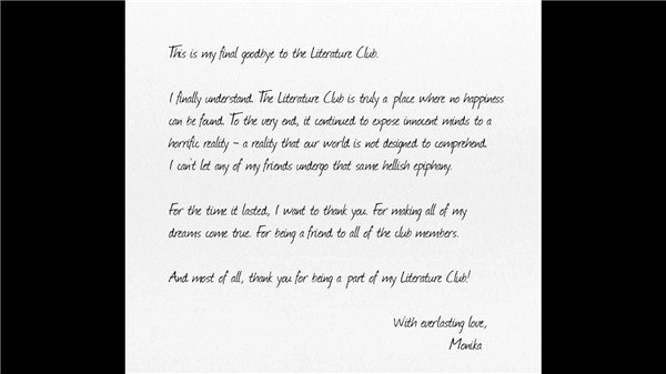 面对得到部长权限将要黑化的Sayori,Monika决心删掉游戏来拯救这一切。伴随着Monika的歌声,游戏CG一张张被删除,最后留给玩家的是Monika的一封信。