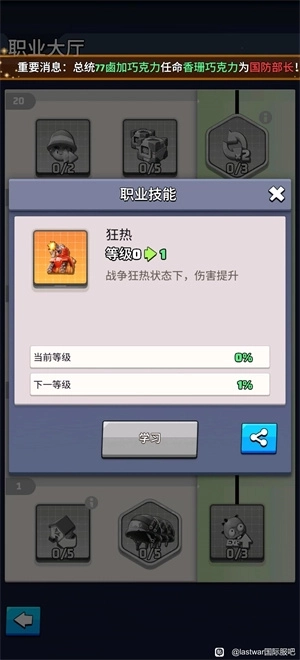 玩家可以通过消耗军团勋章和募兵令来升级军团,军团升级主要增加兵种的等级上限,从而提高兵种的战斗力。玩家达到24级的时候会开启军团玩法,点击创建军团,在创建军团界面,点击“创建军团”按钮进入创建军团界面。军团科技可以提升玩家的军团技能,升级军团科技后可以增加全体成员的战斗力。