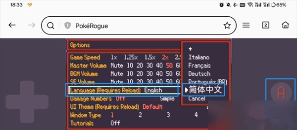5、上下键选中“language[requiresreload]”,“A键”确认,然后上下找到“简体中文”,继续A键确认;