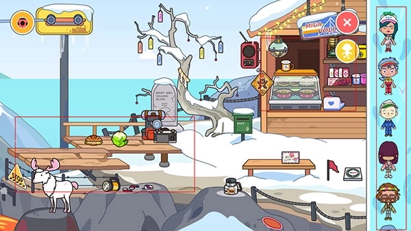 3、右上角有两个角色头像,点击第一个可添加表情效果,第二个则用于选择不同角色并将其放置在雪地场景中。
