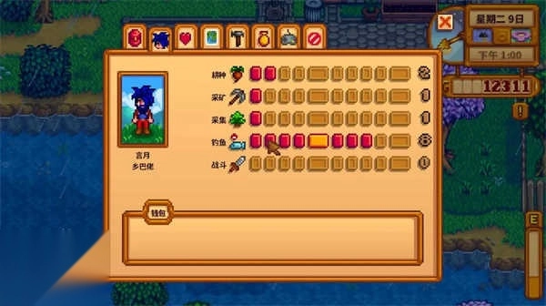 第三天:这一天大概率会下雨,正好不用给作物浇水。我们可以先去矿场前的湖边钓鱼,差不多12点左右应该能升到3级。之后去鱼店卖掉钓到的鱼,买根新鱼竿,再点一碗鳟鱼汤补充体力,接着去河边钓鲶鱼——能钓多少全看运气,主要是想提升下钓鱼等级,顺便小赚一笔,争取最后能升到4级。