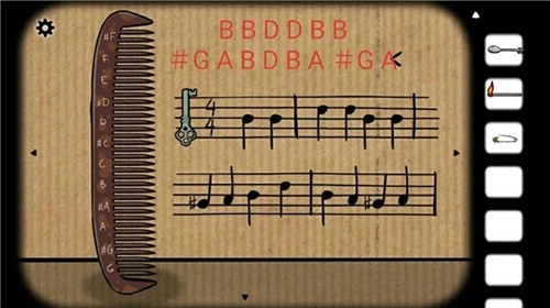 5、将最后一片碎片放入纸壁,显示提示信息「BBDDBB#GABDBA#GA」。点击梳子,输入对应音符后获得「钥匙」;
