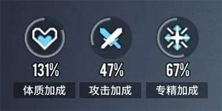 田偌在体质、攻击、专精方面的加成分别是131%、47%和67%。