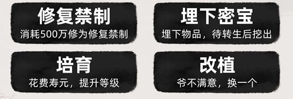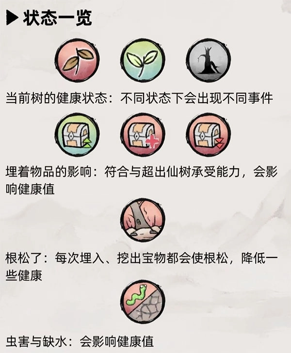 二、功能·禁制:随时间自然损耗,若耗尽则仙树可能被破坏或遭他人偷埋,前者影响健康值,后者导致埋藏物品丢失